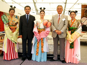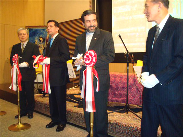 至宝展の開幕セレモニーにはイラン・イスラム共和国日本大使館のセイエッド アッバス アラグチ大使(写真上)をはじめ、外務省中東アフリカ局参事官・上村司氏、特命全権大使の田邊隆一氏、奈良県地域振興部文化観光局次長の寺田豊氏をお招きしてテープカットを行いました(写真左上)。平城京ファッションの女性たちやせんとくんが式典のムードを盛り上げてくれました。 |