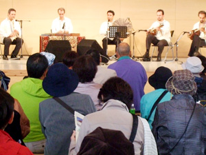 組合が平城遷都1300年祭のためにイランから招聘した「アフランド」のステージは、連日満員で立ち見が出るほどの人気でした。たくさんのお客様にペルシャの伝統音楽をたっぷりお楽しみいただきました。また、ステージに敷かれたペルシャ絨毯の豪華さもお客様の目を奪っていました。 |